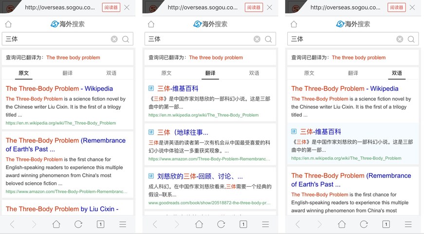近日,搜狗將英文搜索全面升級為海外搜索,旨在幫助不精通英文的中國人搜索和閱讀全世界的醫(yī)療、科技及人文信息。用戶無論輸入中文還是英文,搜索結果在英文原文呈現外,新增了中文翻譯、中英雙語兩大頁面,服務于不精通英文的用戶。這是搜狗把深度神經元網絡翻譯系統(tǒng)與搜索相結合打造的全新產品,也是全球首個提供功能的搜索引擎。(美通社,2017年1月17日北京)