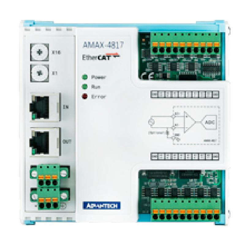 - AMAX-4817 為采用 EtherCAT 通訊協定的工業用 EtherCAT從站模塊,尺寸小巧,并提供 DIN軌道安裝套件,可輕松安裝到機柜內。歐規可插式端子臺可協助使用者進行系統的維護與設置。所有的模擬量輸入通道均受 2,500 VDC 隔離電路保護。