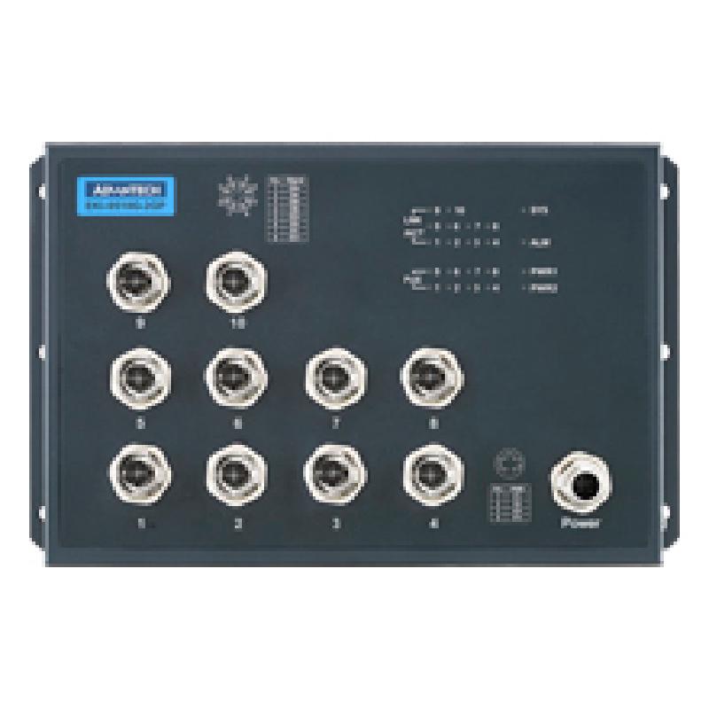 - The EKI-9500 series switch is designed for railway application with rugged and high EMC performance, being suitable for networking solution for rolling stock and wayside applications. The EKI-9500 series provides M12 connectors for Ethernet/ console/ relay/ power-input connections to ensure tight & robust connectivity, and thus to guarantee reliable operation against environmental disturbances such as vibration and shock on train. The EKI-9510E-2GPH & EKI-9510E-2GPL are PoE Ethernet switches that provide 8 x Fast Ethernet M12 D-coded ports with IEEE802.3af/at PoE(Power Over Ethernet) function. The PoE ports can provide up to 100Watts power budget for P.D. devices (such as camera, IP-phone and wireless access point). Each of them also provides 2 x Gigabit Ethernet M12 X-coded ports with Bypass function to increase the reliability of the network. EKI-9510E-2GPH/ PL features a "flat" design which can be easy deployed with its slender size and make network deployment easier in crowded carriage/ cabinet.
